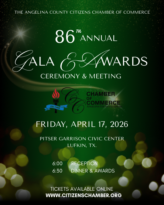 Join us for a night of recognition and community spirit at the Pitser Garrison Civic Center in Lufkin, Texas, as we celebrate the remarkable 86 -year journey of the Angelina County Citizens Chamber of Commerce.